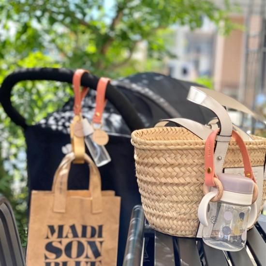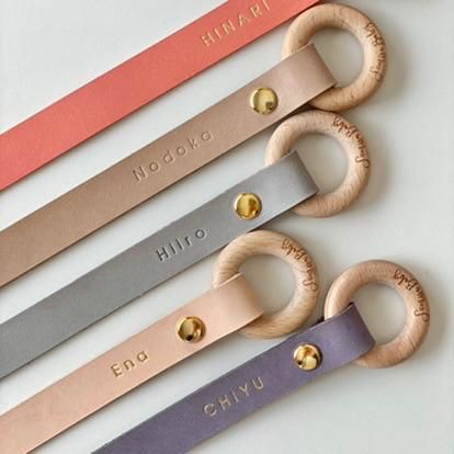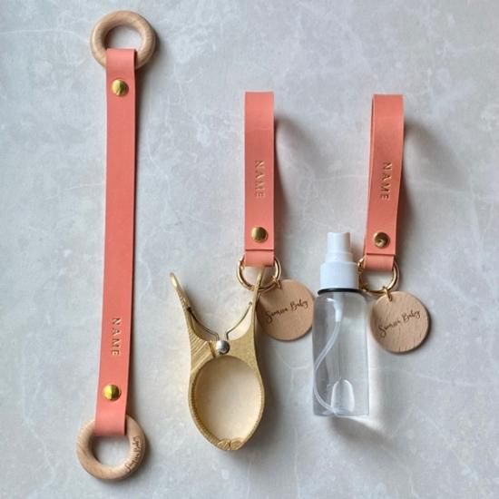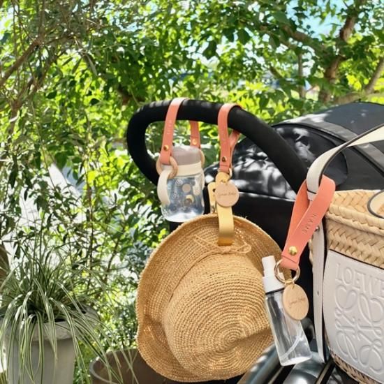 レザーストラップがスナップボタンで開きますので、ベビーカーやバッグなどに取り付けてご使用ください。