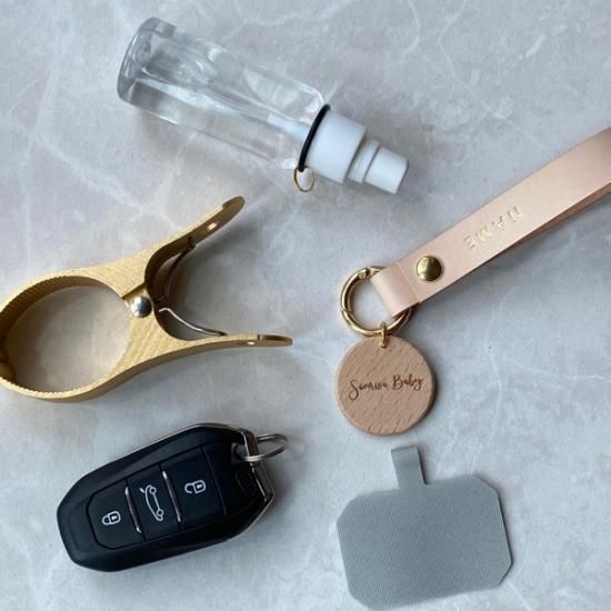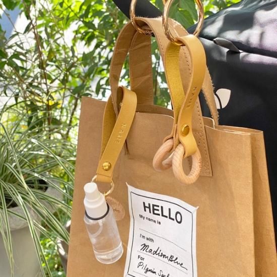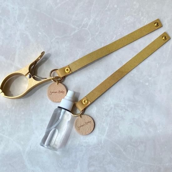 イタリア・テンペスティ社の人気レザー・Maineでお作りしたシンプルなデザインのマグホルダー・シューズクリップ・アルコールジェルホルダーです。